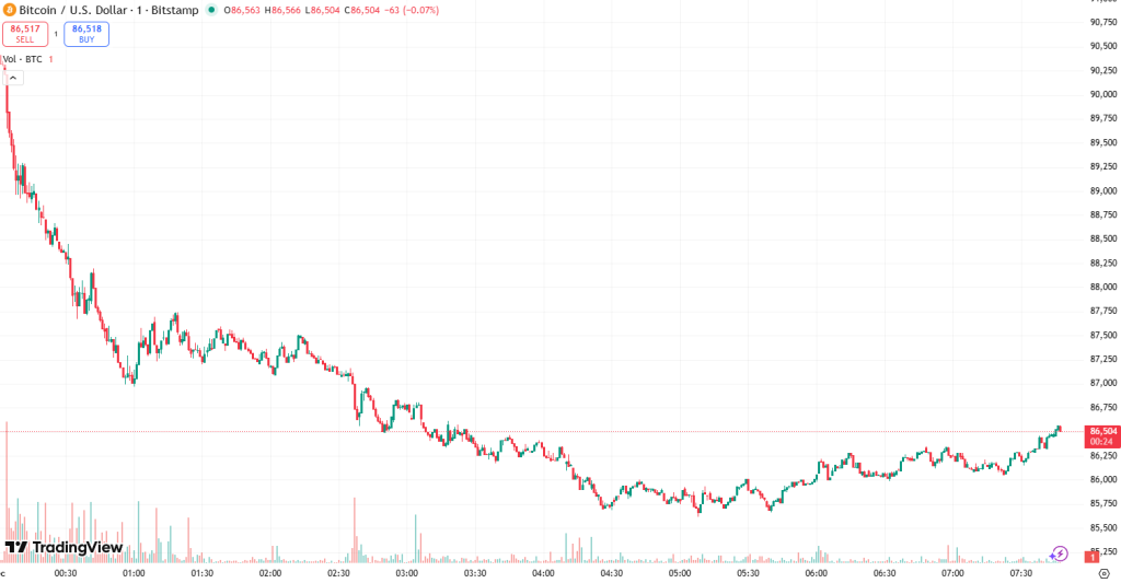 - На момент написания материала, в понедельник утром Биткоин торговался на уровне $86 153. Ранее цена резко упала с внутридневного максимума $91 904 до $85 694.