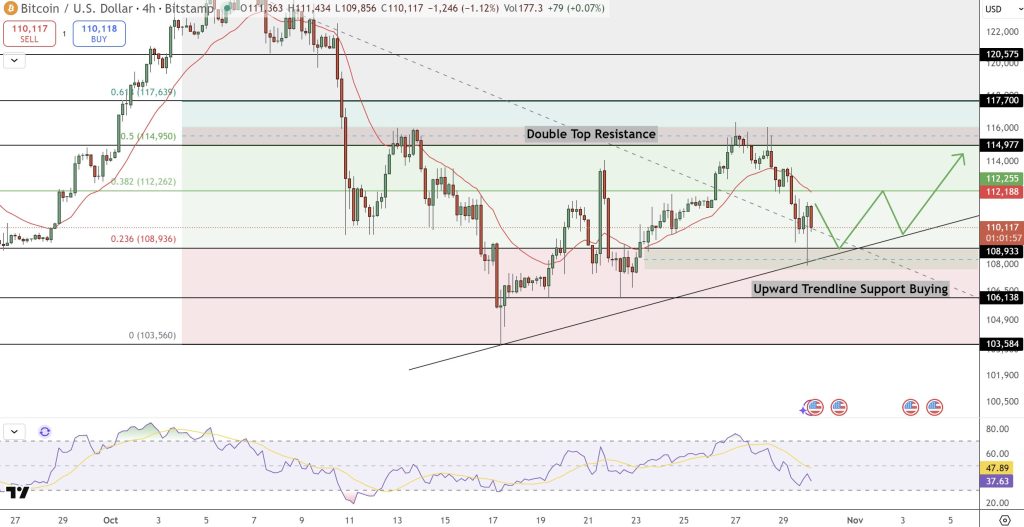 Обратимся к техническому анализу. Если взглянуть на графики, видно, что цена биткоина сейчас консолидируется (колеблется) около отметки в $110 000. Она немного поднялась после резкого отскока вниз от уровня сопротивления примерно в $117 700. На графике формируется “нисходящий клин”. Это паттерн, который часто сигнализирует о предстоящем росте.