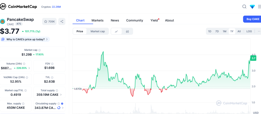 CAKE сейчас торгуется около $3,8, и это рост на 14% за сутки. Движение основано на Tokenomics 3.0, которая продолжает сокращать предложение через ежемесячное сжигание токенов. В августе было уничтожено около 2,7 млн CAKE, что продолжает двухлетнюю серию при текущей модели.
