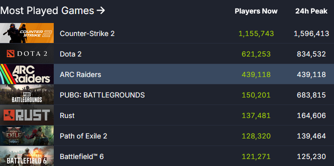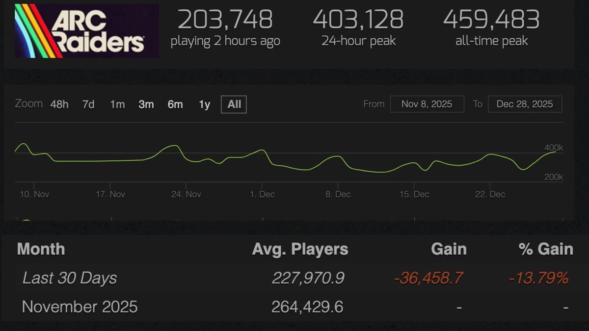 Что впечатляет – ARC Raiders сохранила 86% аудитории с момента достижения пика в почти 460 тысяч игроков одновременно.