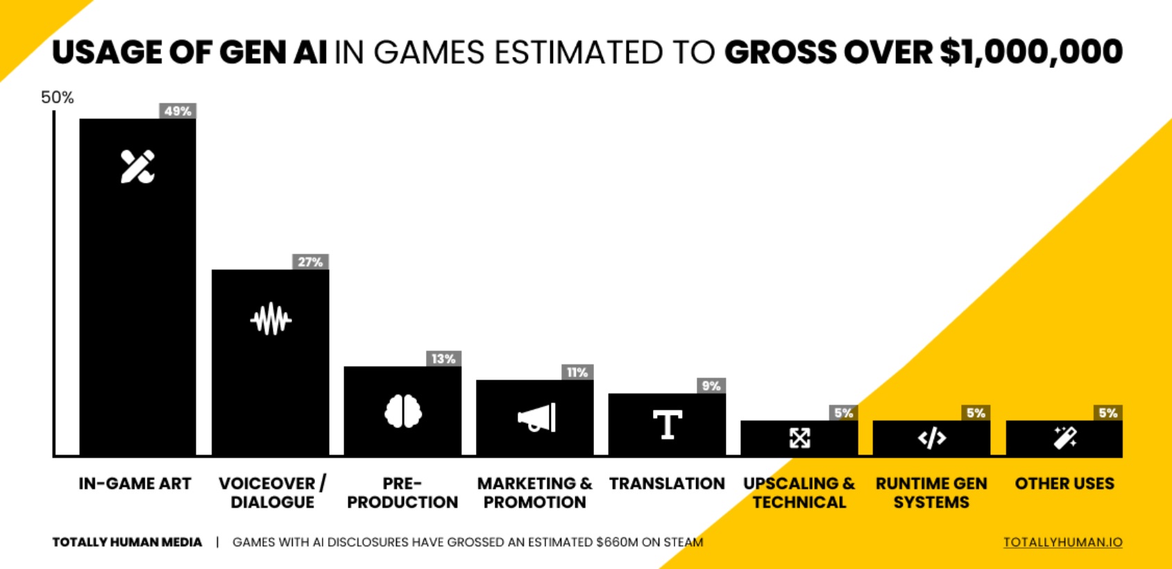 Согласно отчету Totally Human Media, 10 258 игр в Steam – около 8% всей библиотеки платформы – в той или иной мере используют генеративный ИИ. Пять месяцев назад таких тайлов было на две с половиной тысячи меньше (7 818), и студии, использующие ИИ, не собираются останавливаться.