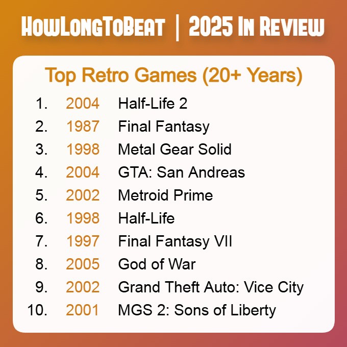 На это указывает статистика HowLongToBeat – сайта, отслеживающего время прохождения игр. Ресурс публикует различные топ-10 в конце каждого года, показывая, во что люди играли больше всего. Один из топов 2025 года сфокусирован на ретро-играх, к которым игроки возвращались, и обе предыдущие части Half-Life попали в список.