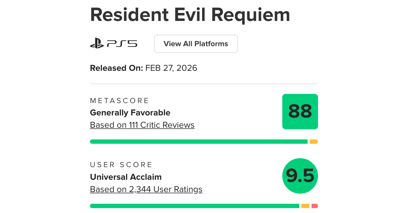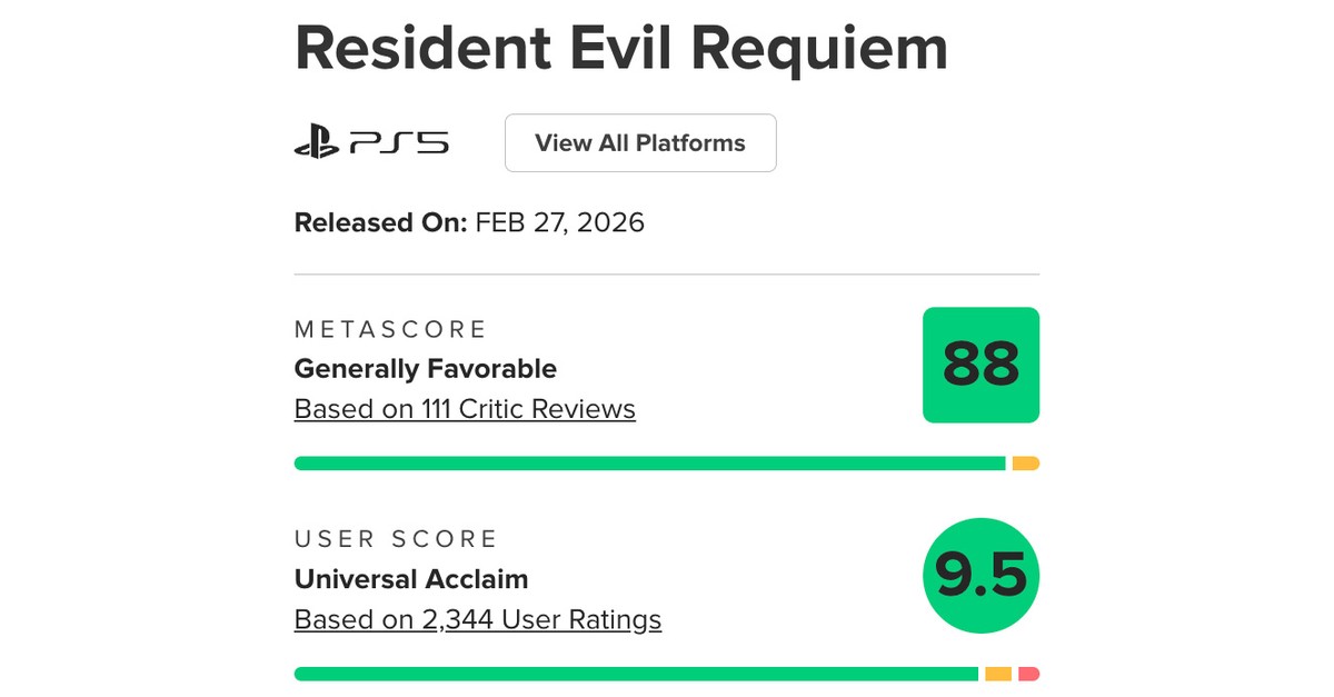 Гонка за звание лучшей игры 2026 года официально началась. Mewgenics задала высокую планку, получив 88 баллов на Metacritic, а спустя всего две недели долгожданная Resident Evil Requiem уверенно повторила этот результат. В процессе новинка от Capcom стала самой высоко оценённой игрой серии за последние 20 лет.