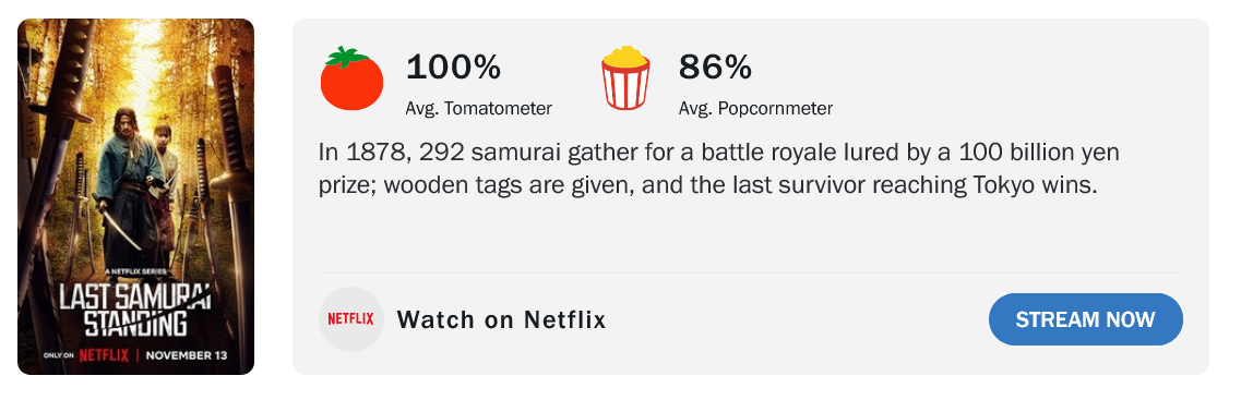 Боевик с захватывающими боями о борьбе оставшихся самураев и различных воинов собрал 6,2 миллиона просмотров и 31,7 миллиона часов за первые дни проката. Действие сериала разворачивается в Японии конца XIX века и следует за группой бойцов, соревнующихся за денежный приз, чтобы спасти любимых. Постановка получила максимальную оценку критиков на Rotten Tomatoes, а зрители поставили шоу 85%.