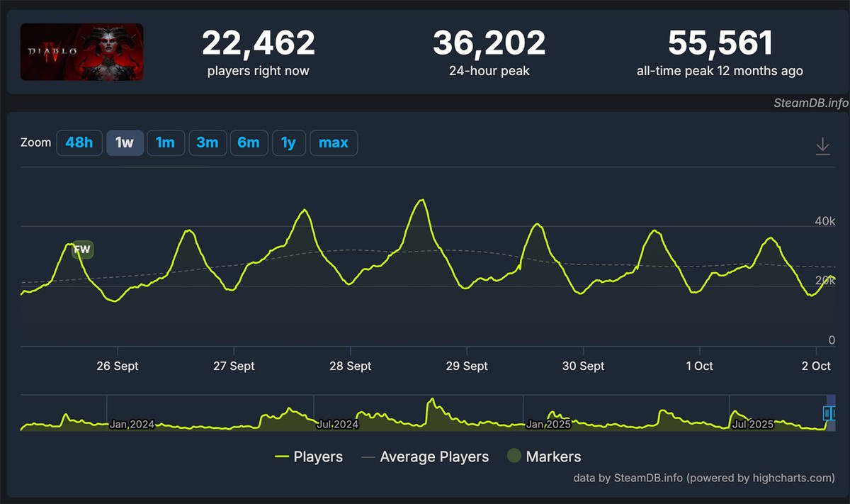 Diablo 4, как минимум, демонстрирует стабильность на данный момент. По данным SteamDB, ARPG насчитывает десятки тысяч одновременных игроков, что не так далеко от пика в 55 561 человек – и это при том, что версия в Steam появилась после оригинального запуска в Battle.net. Разработчики планируют выпустить следующее крупное дополнение в 2026 году. Однако именно эта часть работы вызывает у Бревика ощущение сдавленности.