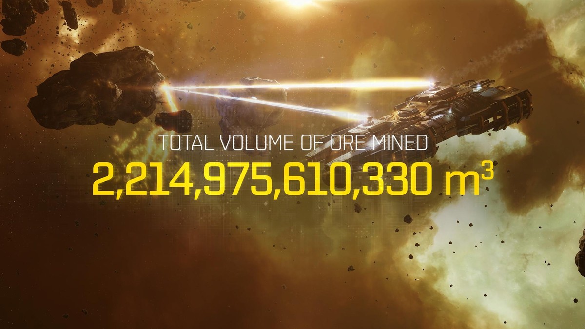 CCP также поделилась другими масштабными цифрами – игроки добыли 2 214 975 610 330 кубометров руды, из которой переработали материалов на сумму 380 532 846 570 048 ISK.