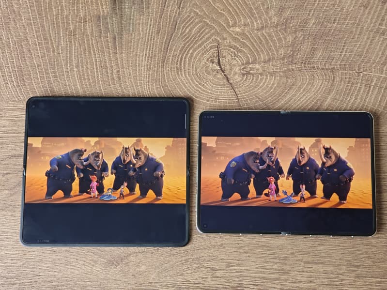 В глаза бросается то, что на большом внутреннем экране при просмотре широкоформатных роликов остаются очень большие черные полосы сверху и снизу на обоих смартфонах. Кроме того, складку у обоих смартфонов легко можно найти на фото.