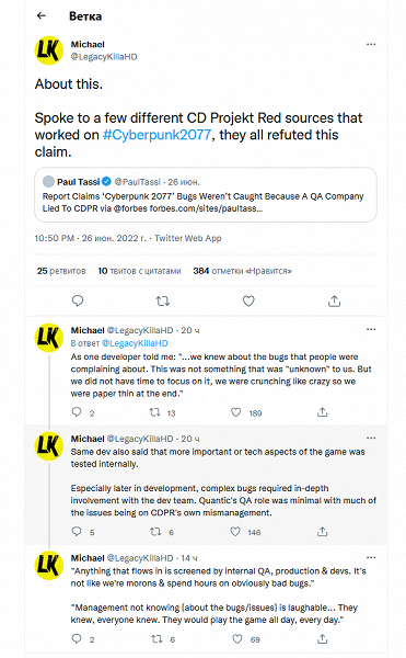 При этом YouTube-блогер LegacyKillaHD, который ранее обозревал Cyberpunk 2077, спросил о ситуации нескольких разработчиков из CD Projekt RED на условиях анонимности. По их словам, они знали о проблемах в игре, однако на их исправления не хватило времени.