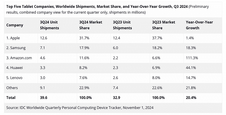 В третьем квартале компания заняла 31,7% рынка, продав 12,6 млн устройств и нарастив продажи на 1,4%. Samsung на втором месте может похвастаться лишь 7,1 млн и долей 17,9%. Правда, компания смогла повысить продажи на 18,3%, то есть в разы заметнее Apple.